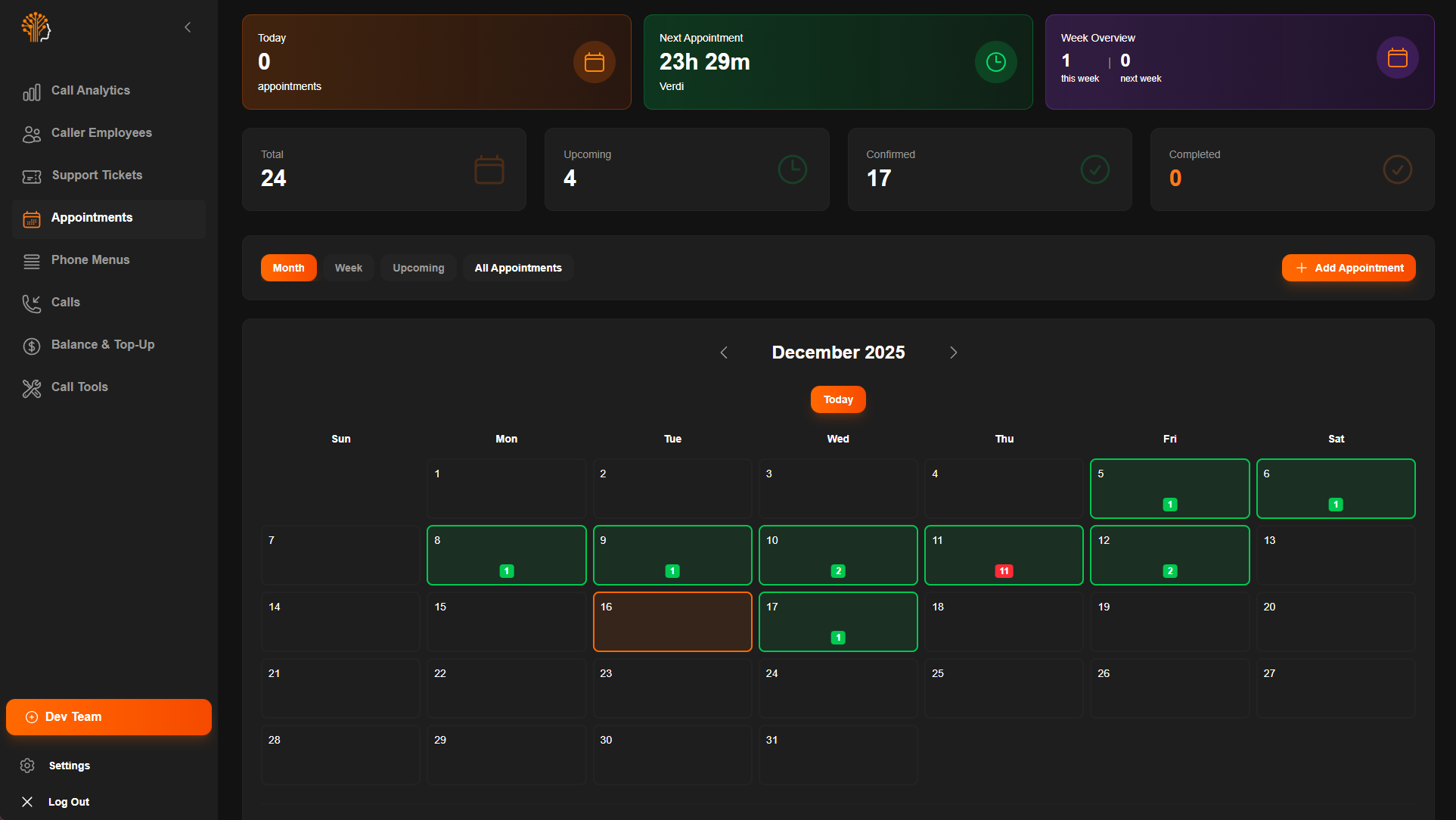 Track appointments booked via AI phone calls, public booking links, or manual entry, all in one place