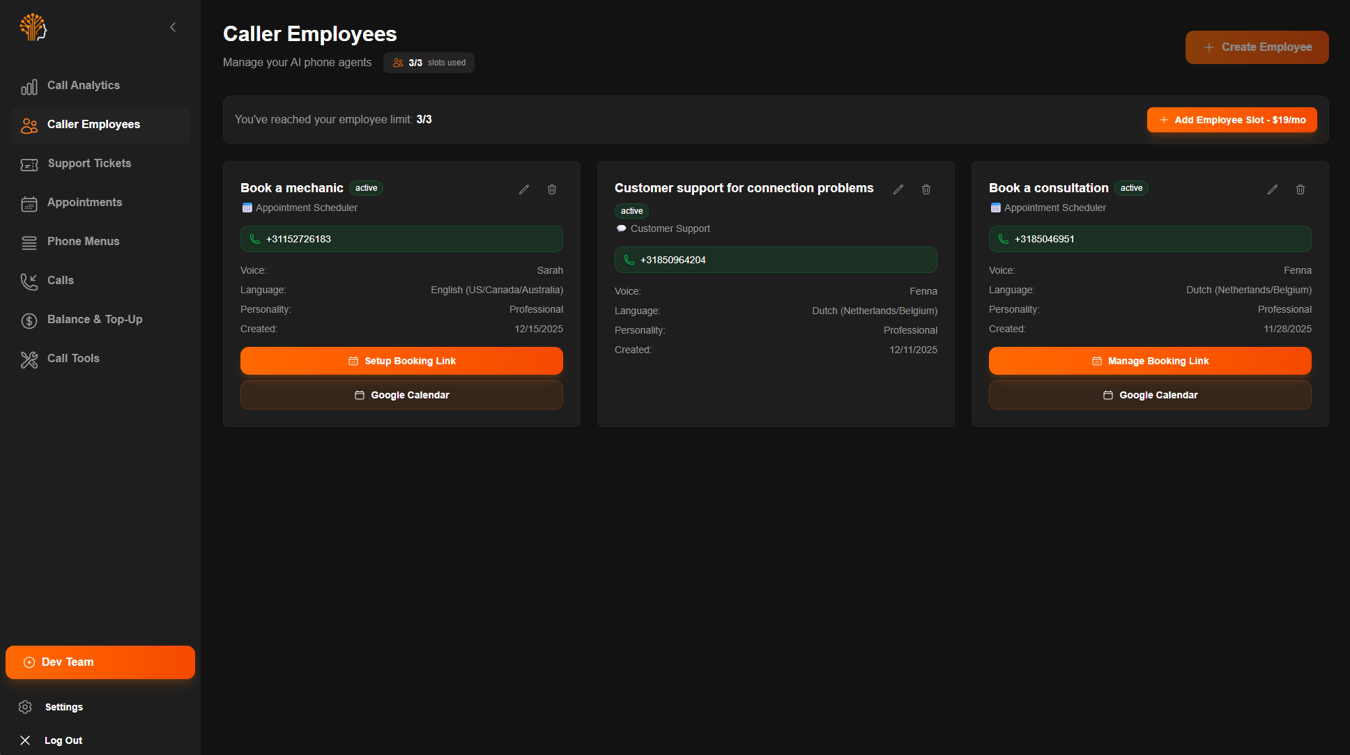 Create AI employees that handle customer calls with your brand's voice. Track conversations, automate appointments and support, and scale from one to unlimited capacity, without call center complexity.
