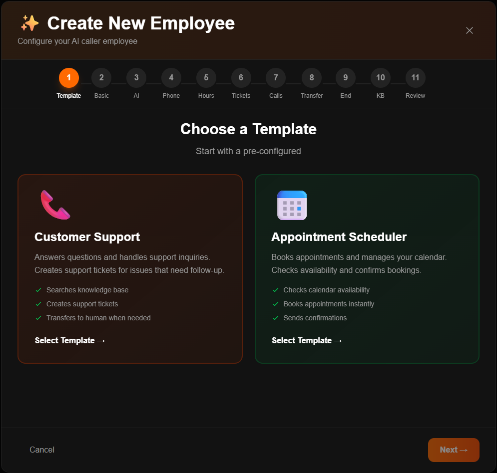 Deploy customer support or appointment scheduling AI employees in minutes. Choose your template, customize how they handle calls through simple edits, and launch instantly. Update scripts with one click, manage multiple call types from one dashboard, and scale capacity on demand. professional call handling without the complexity