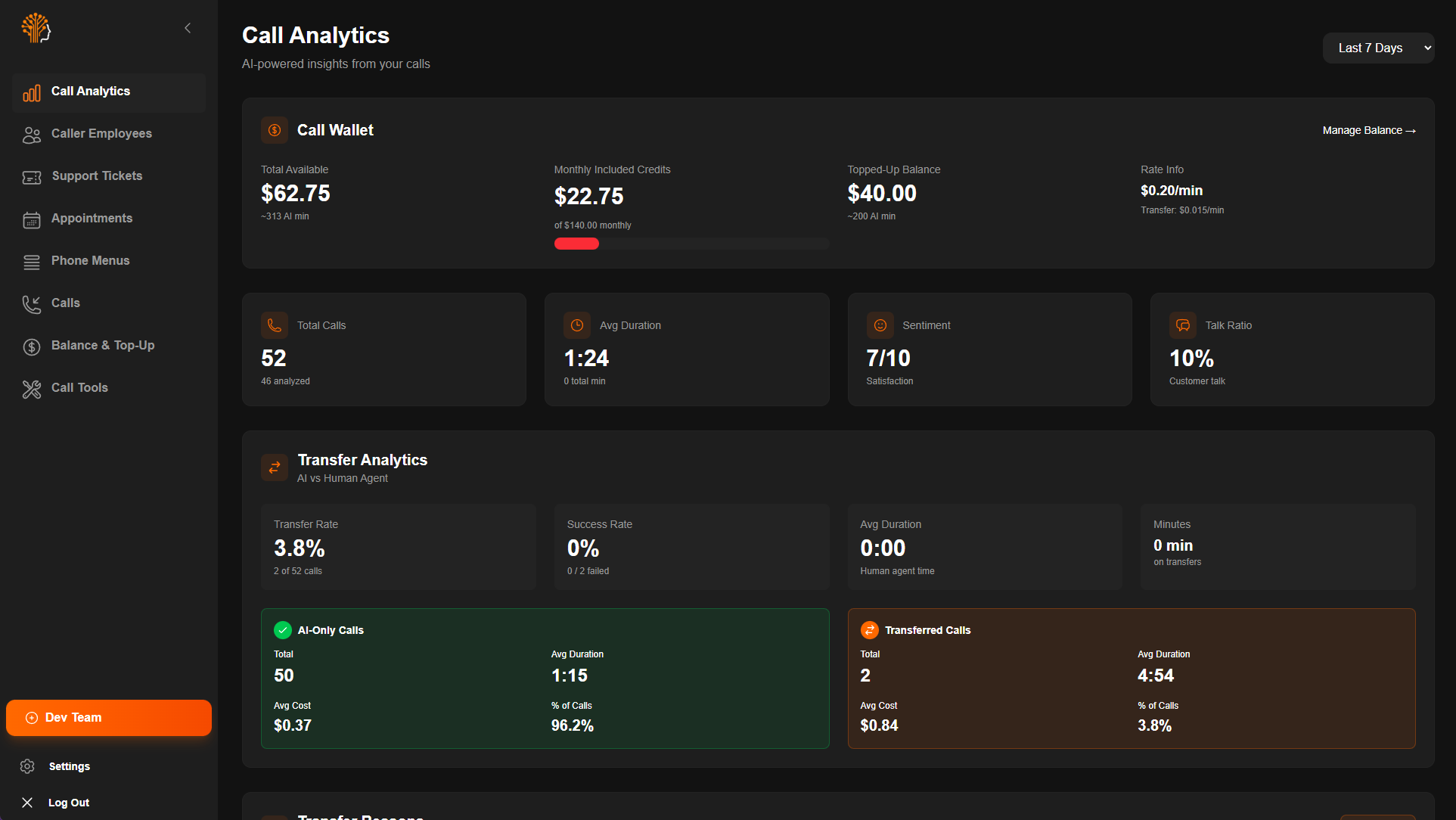 Track every metric that matters with comperhensive call analytics. Monitor total call volume, average duration, and custtomer sentiment in real time, while analyzing transfer rates between AI and human agents for optimization insights. view detailed cost breakdowns per call, measure success rates automatically, and identify performance patterns across your entire operation. Complete visibility into call performance, costs and customer satisfaction in one dashboard.